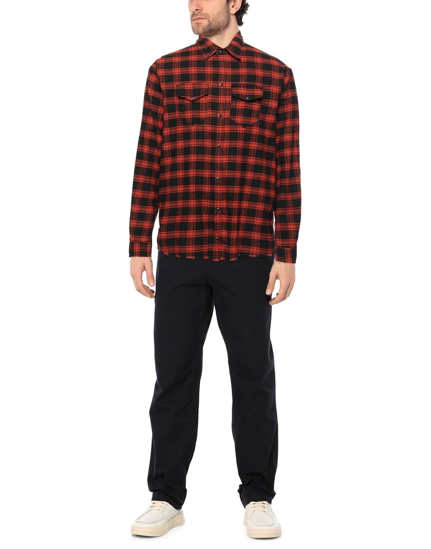 flannel, no appliqués, tartan pattern, classic neckline, long sleeves, snap button cuffs, snap buttons fastening, two breast pockets