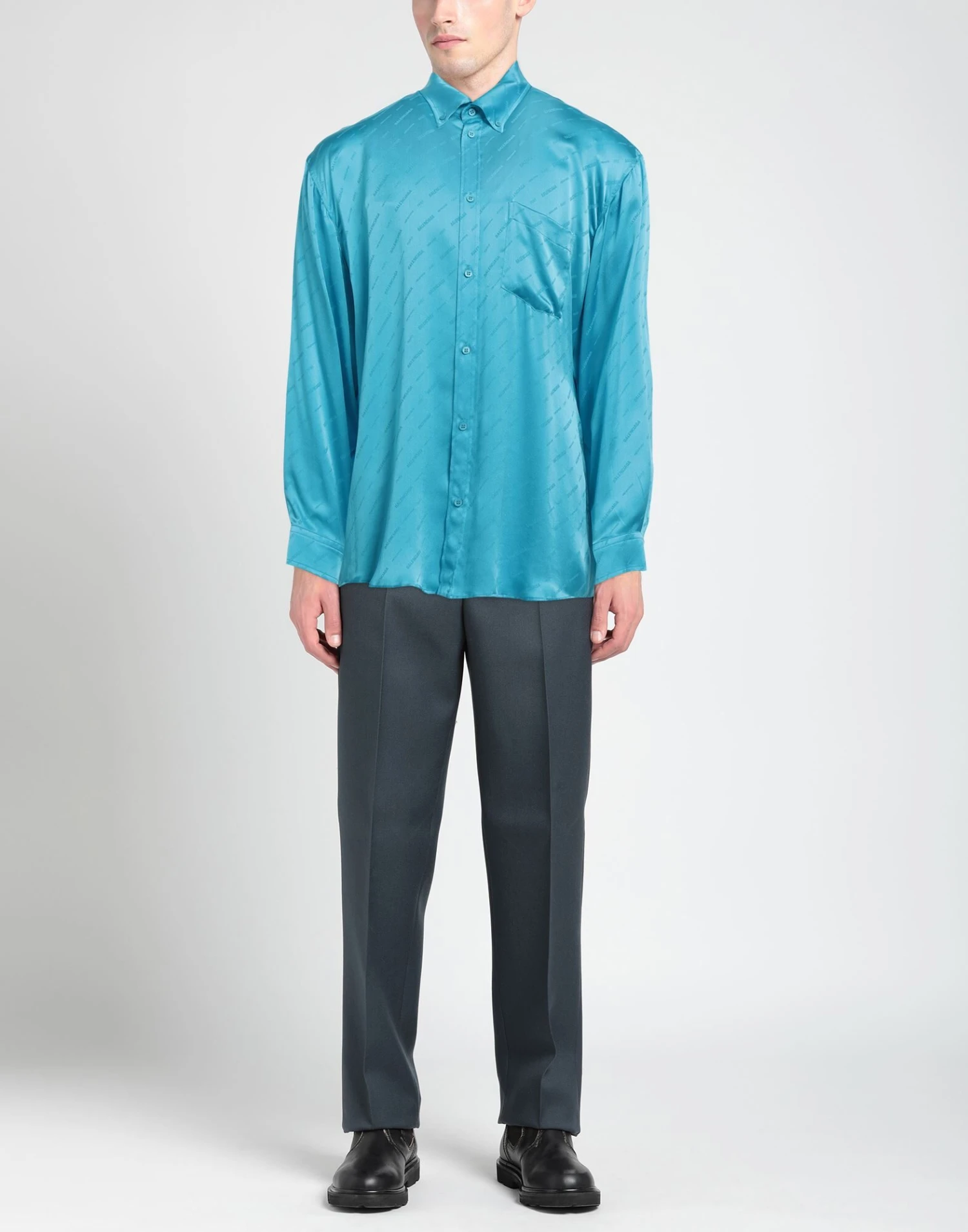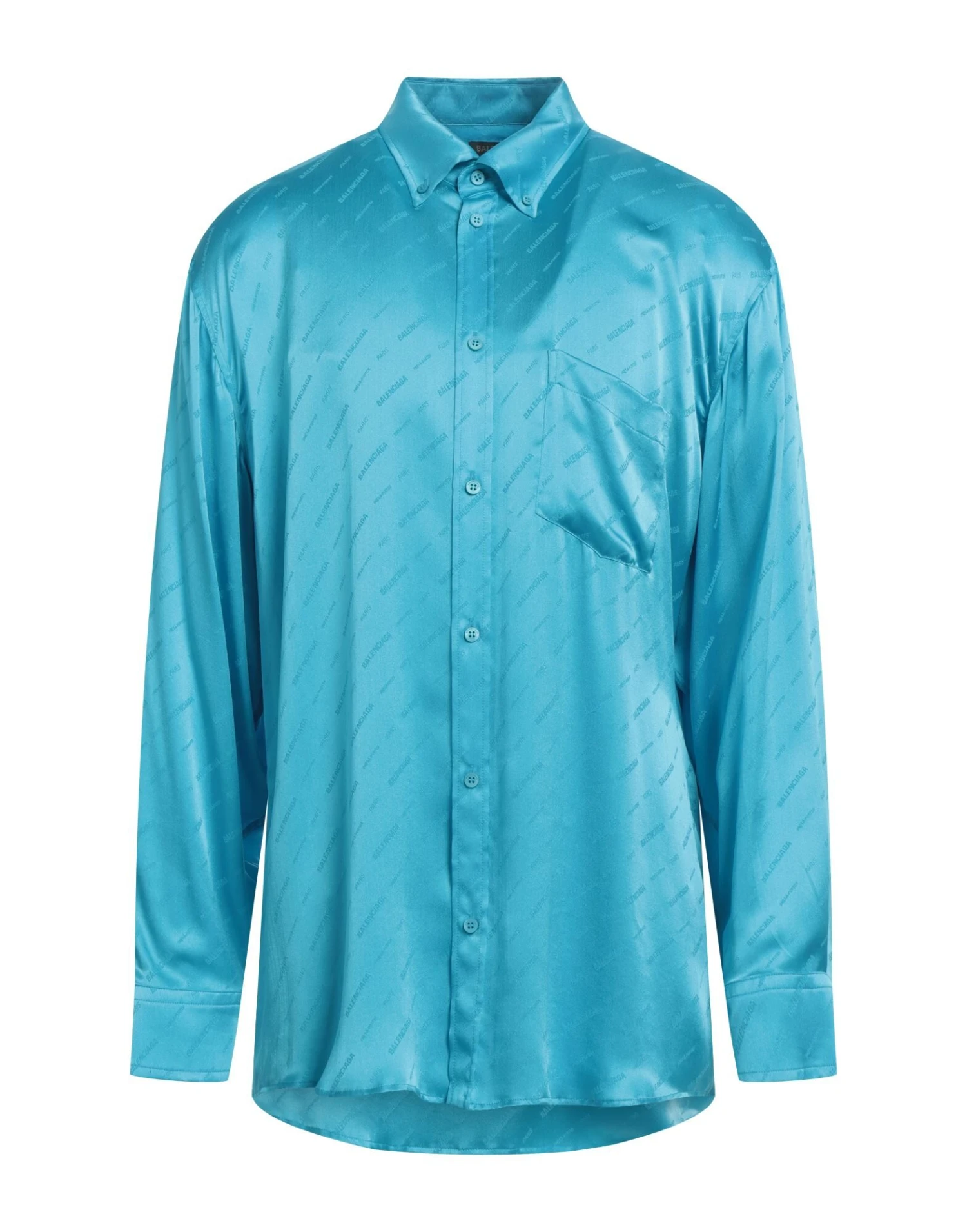 satin, brand logo, logo design, button-down collar, long sleeves, buttoned cuffs, button closing, single chest pocket, contains non-textile parts of animal origin, large sized