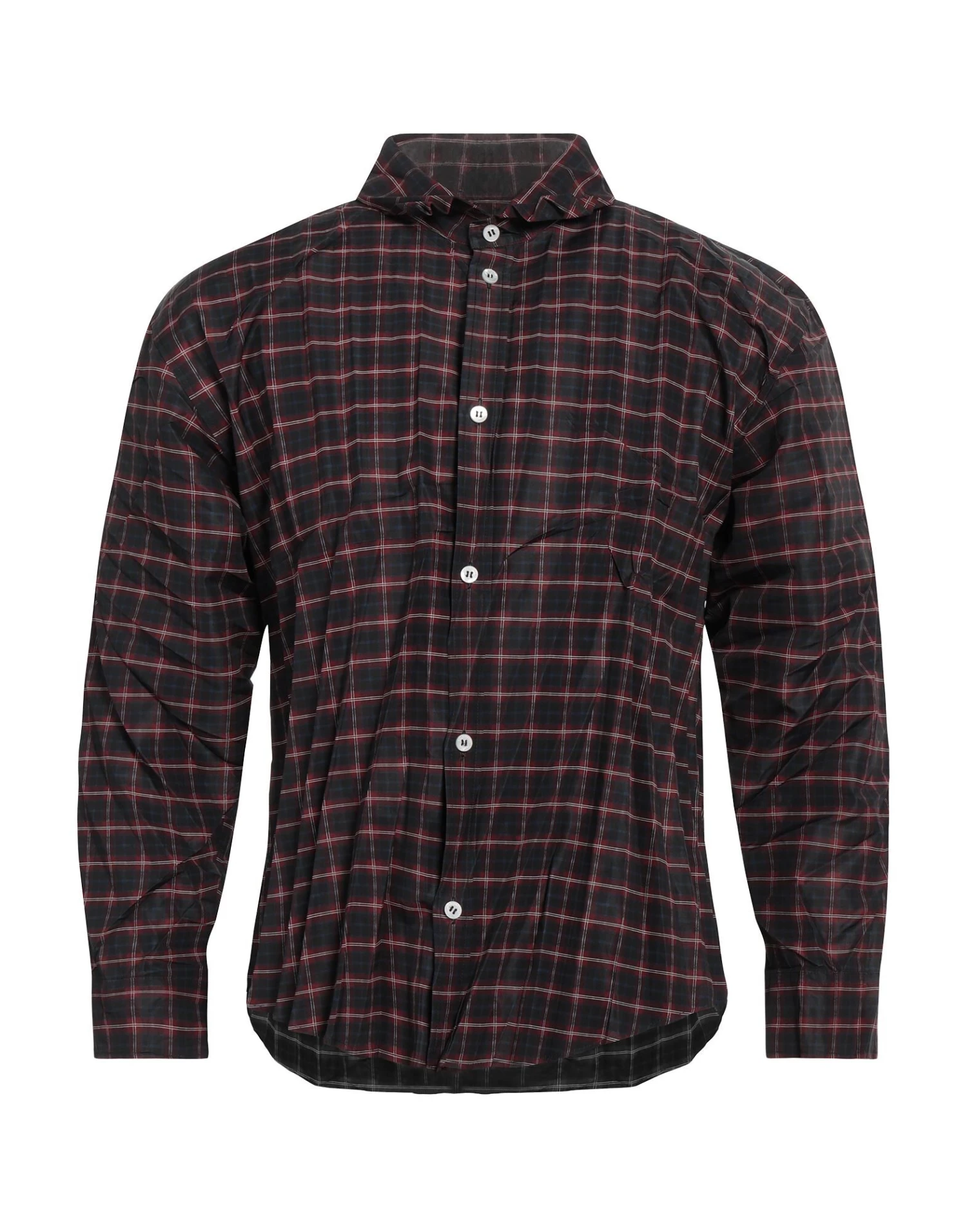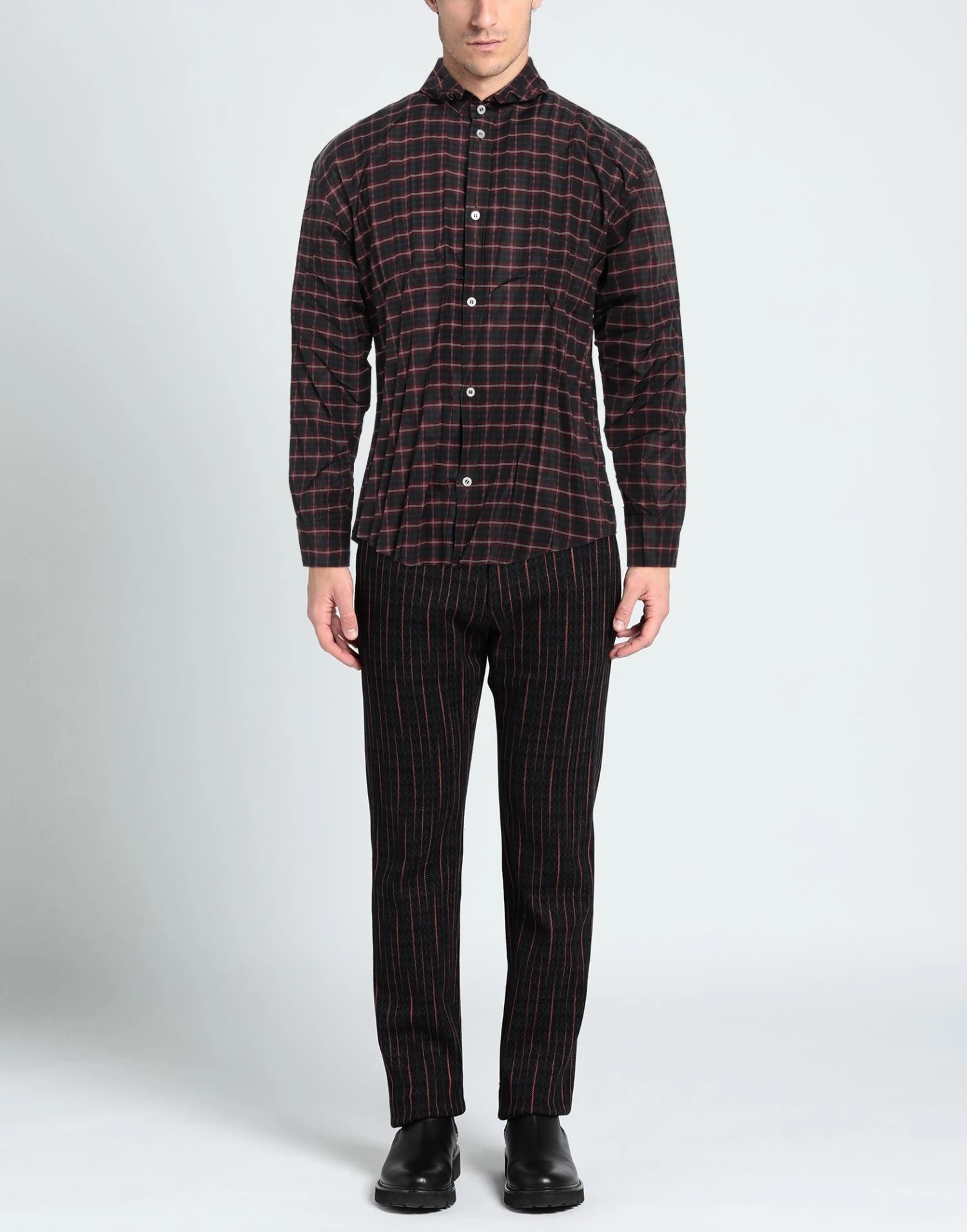 techno fabric, no appliqués, tartan pattern, classic neckline, long sleeves, buttoned cuffs, button closing, no pockets, contains non-textile parts of animal origin, large sized