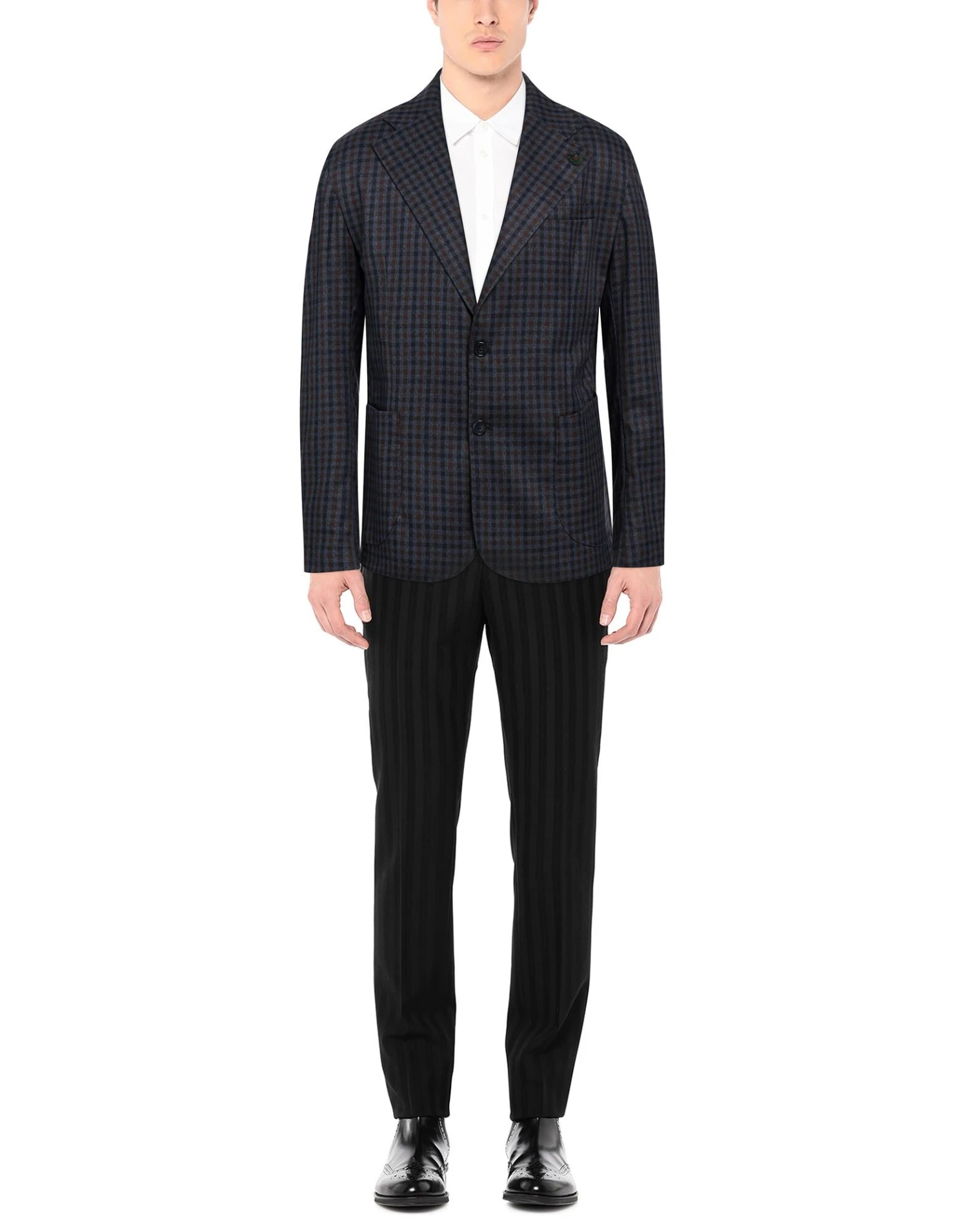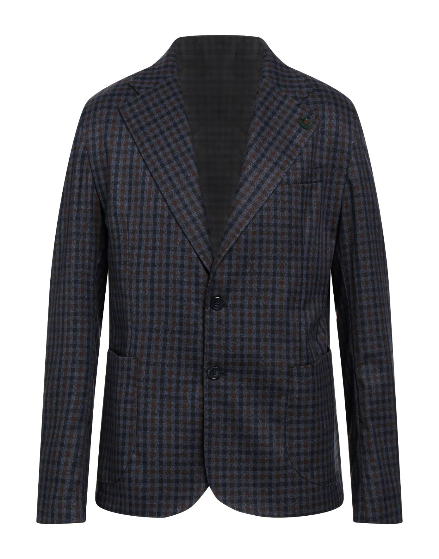 plain weave, no appliqués, checked, lapel collar, single-breasted , long sleeves, buttoned cuffs, partially lined interior, 2 buttons, multipockets, dual back vents