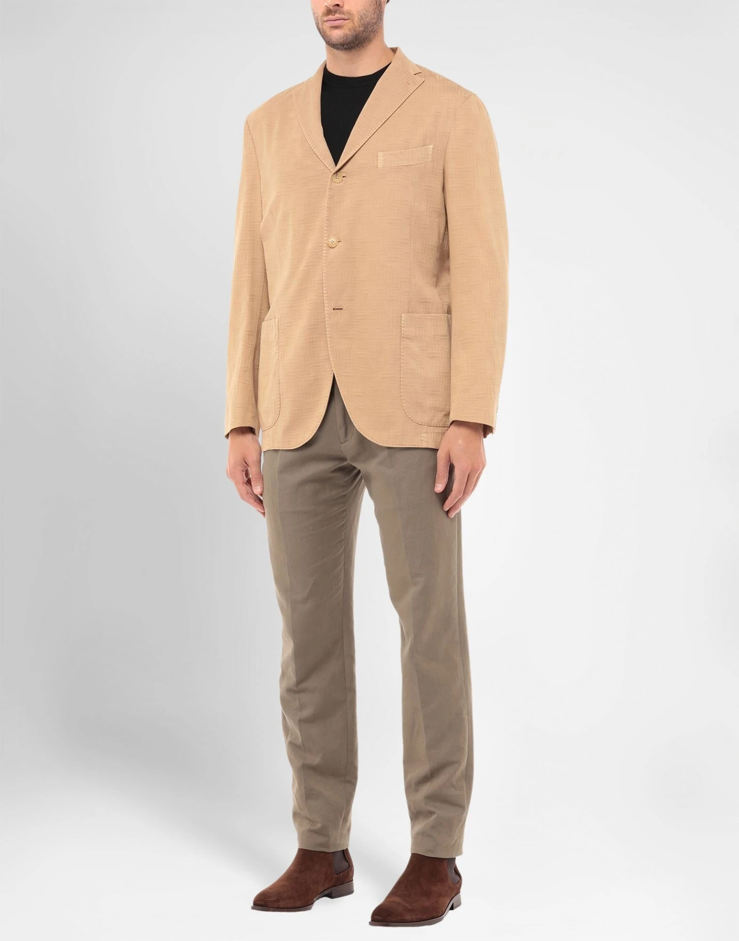 plain weave, no appliqués, basic solid color, lapel collar, long sleeves, single-breasted , multipockets, button closing, single chest pocket, internal pockets, unlined, dual back vents, stretch