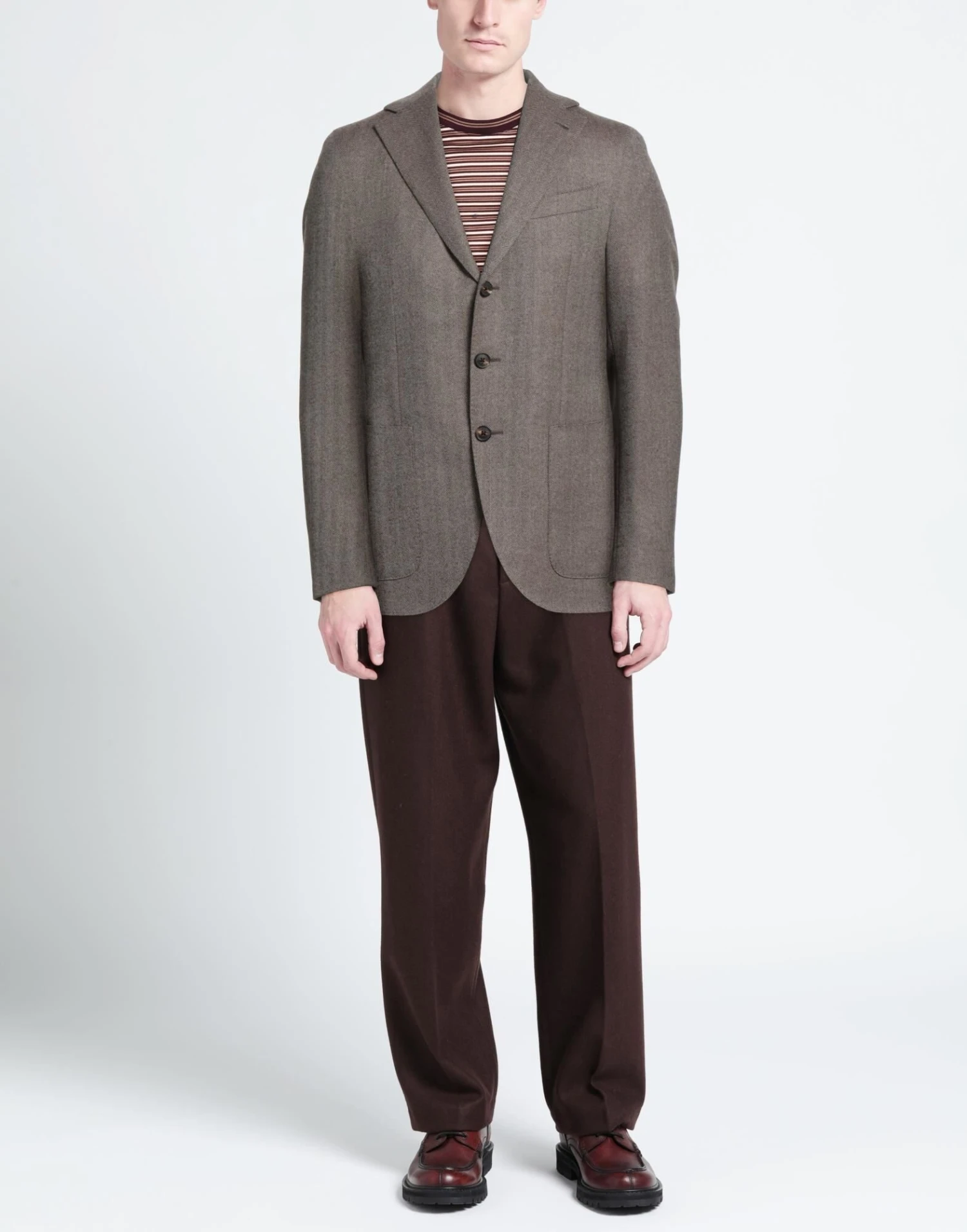 flannel, no appliqués, herringbone, lapel collar, single-breasted , long sleeves, partially lined interior, button closing, multipockets, dual back vents, single-breasted jacket