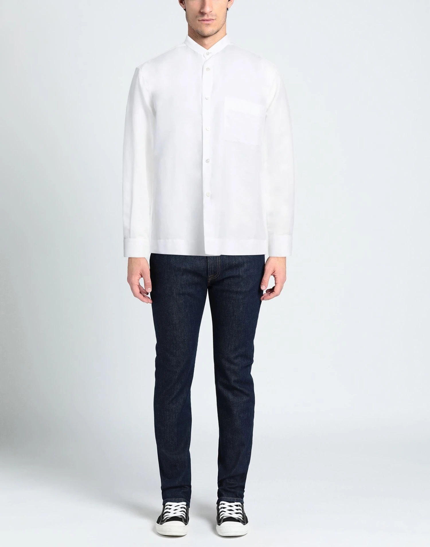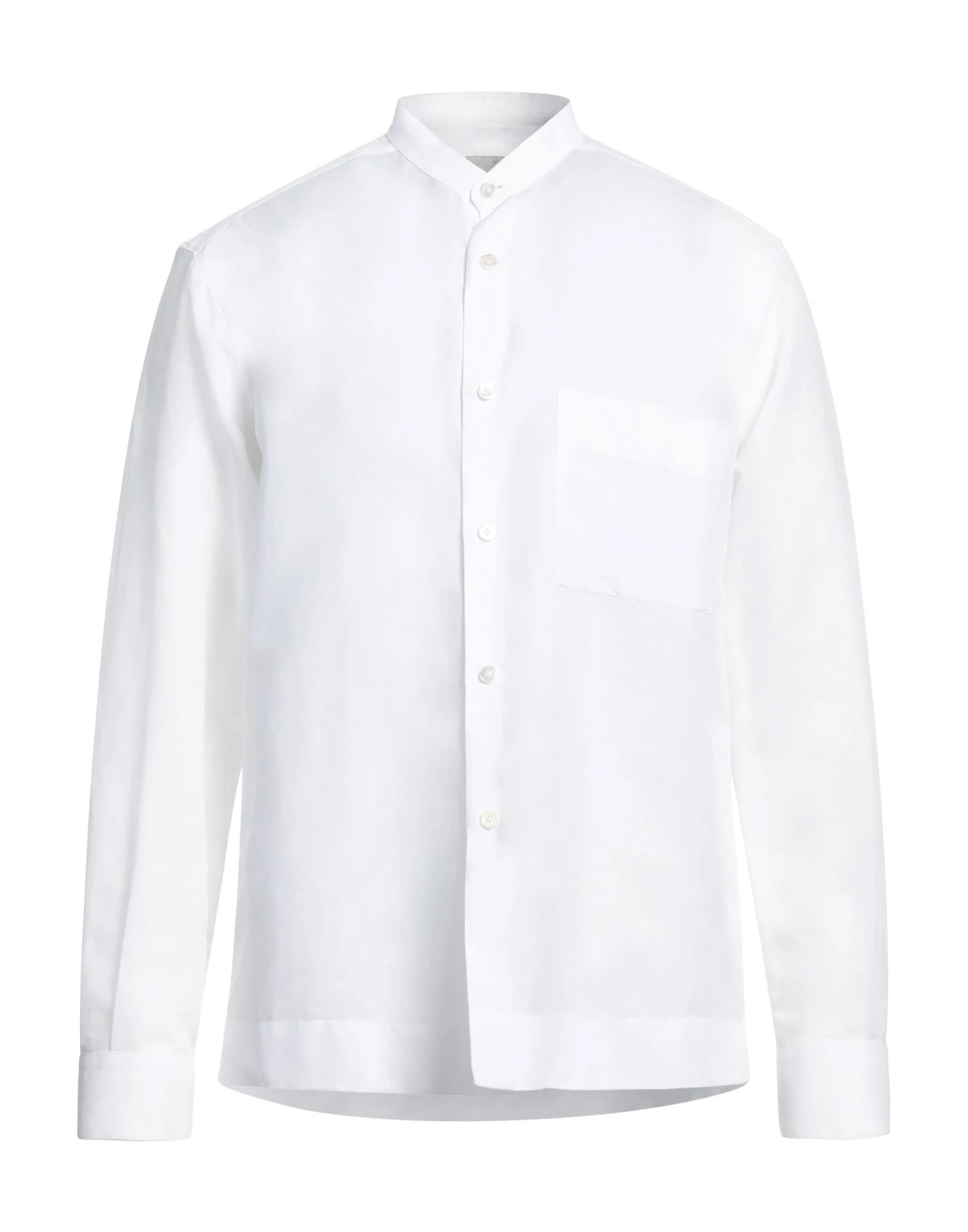 plain weave, no appliqués, solid color, mandarin collar, long sleeves, buttoned cuffs, button closing, single chest pocket, contains non-textile parts of animal origin