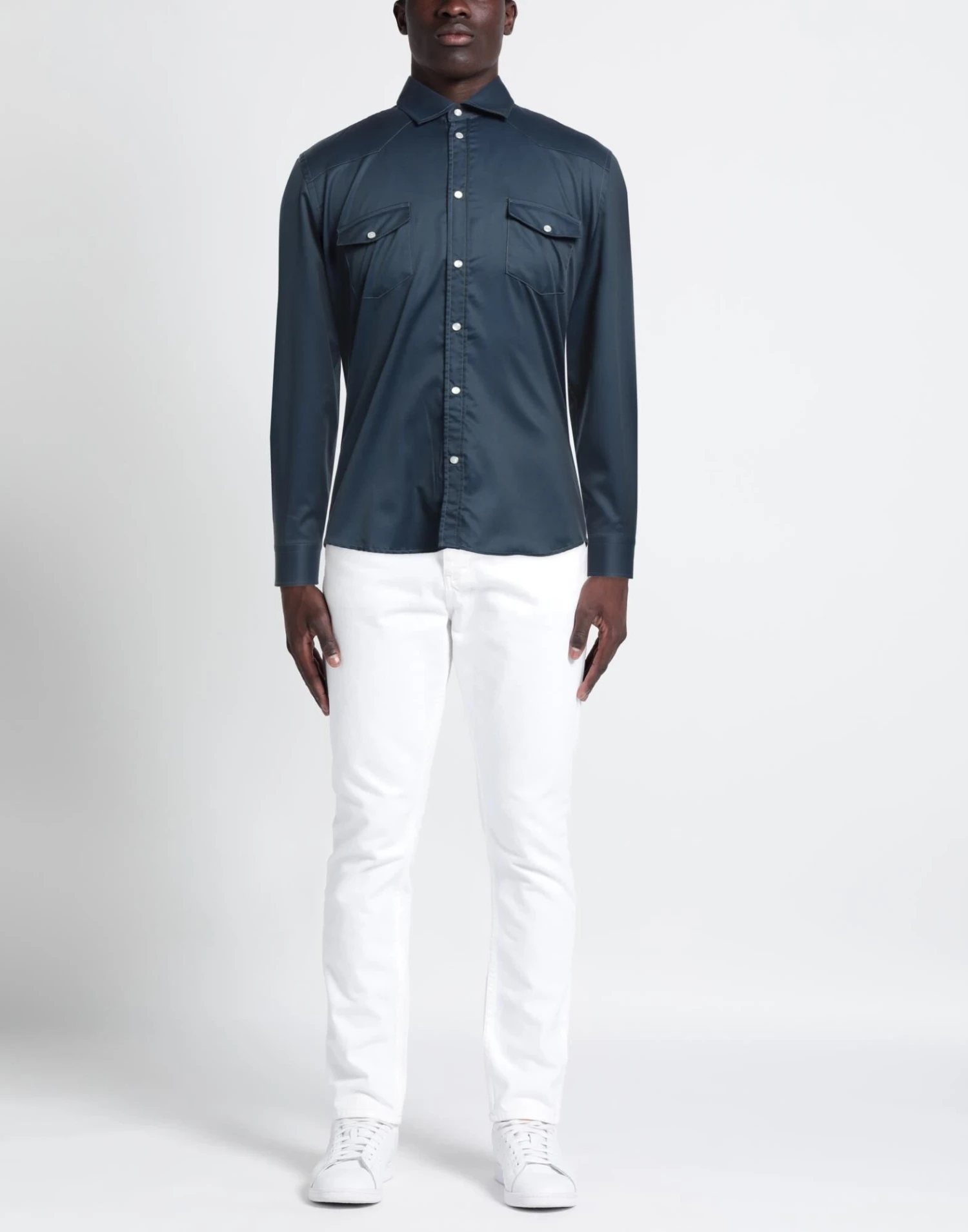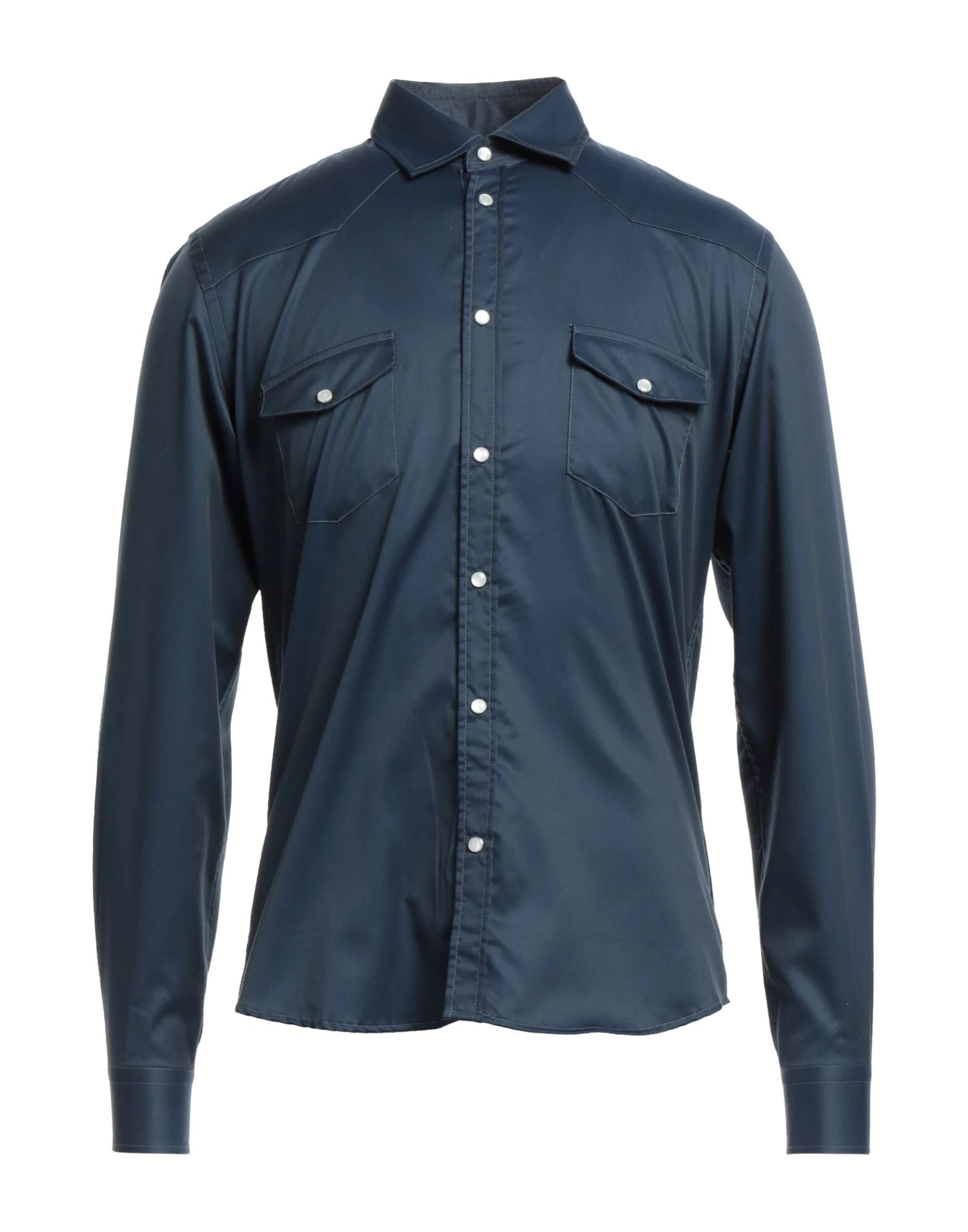 plain weave, brand logo, solid color, classic neckline, long sleeves, snap buttons fastening, two breast pockets, stretch