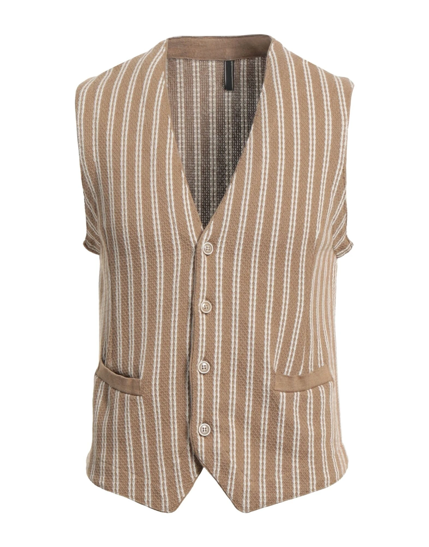 knitted, lightweight knit, no appliqués, stripes, two-tone, v-neck, sleeveless, button closing, multipockets