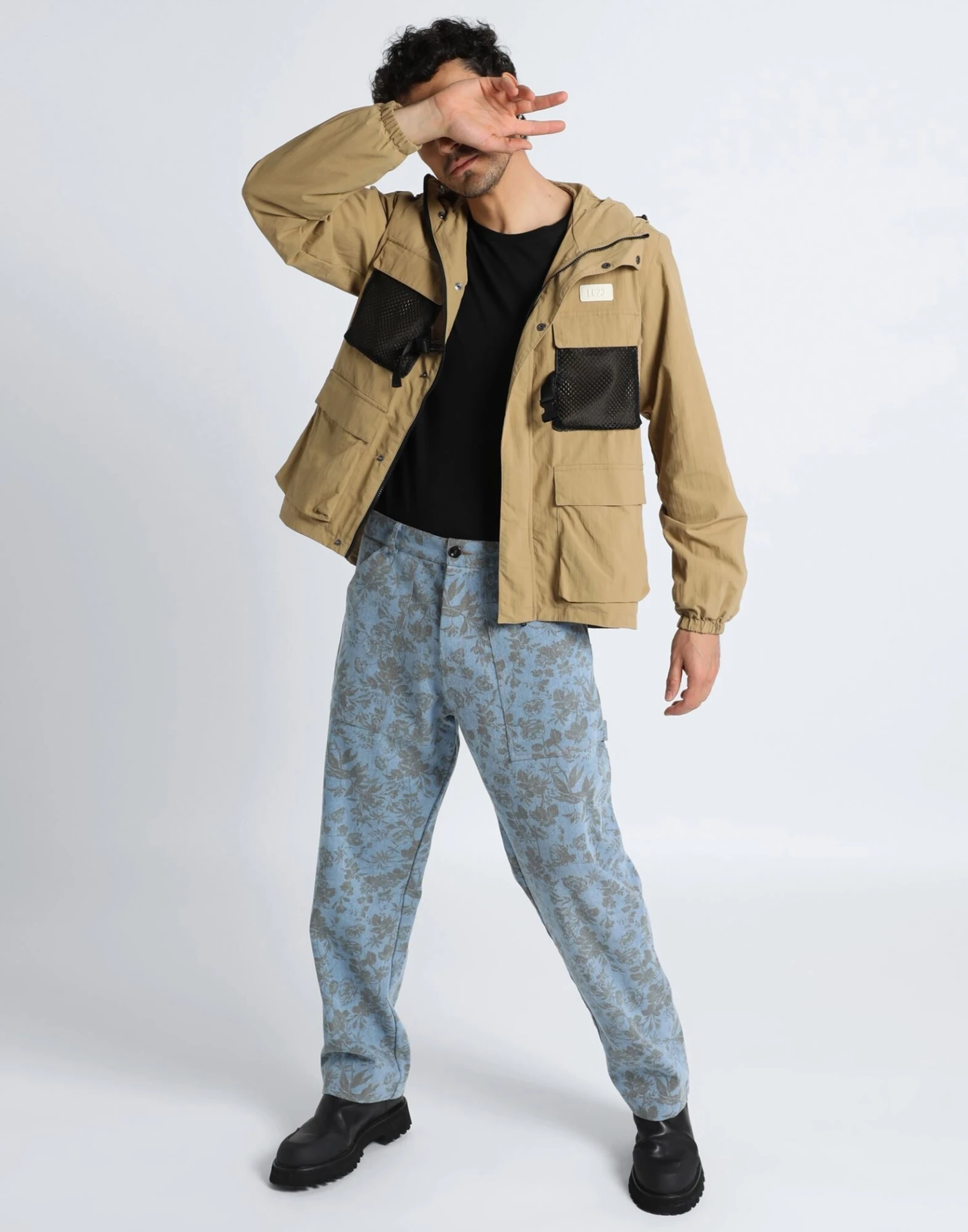 techno fabric, mesh fabric, brand logo, buckle, two-tone, hooded collar, single-breasted , long sleeves, cuffs with elastic, fully lined, zipper closure, snap buttons fastening, multipockets, lifestyle, safari