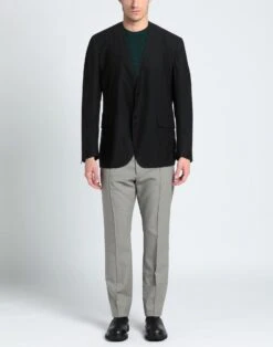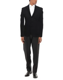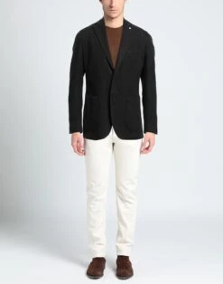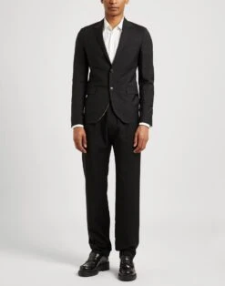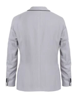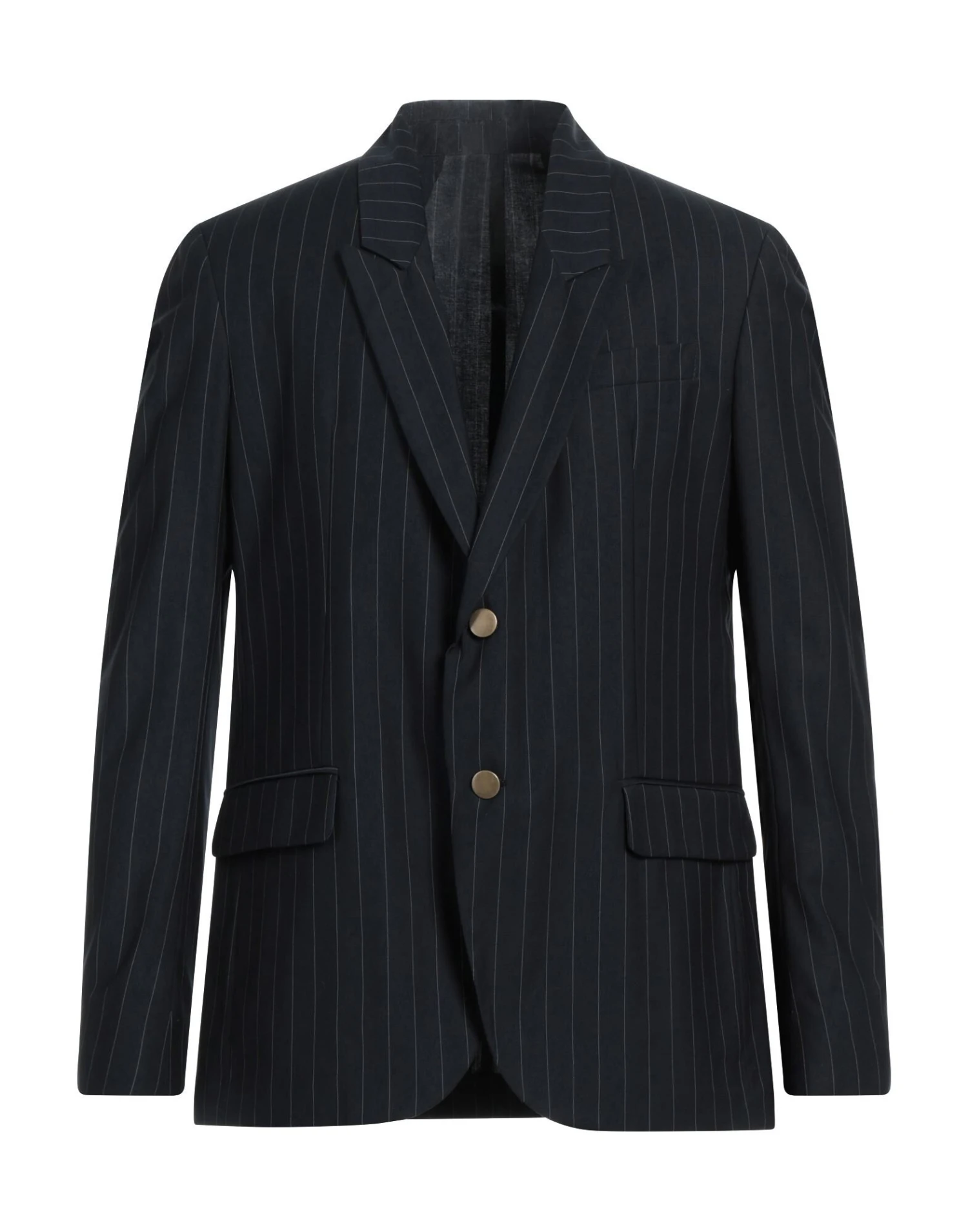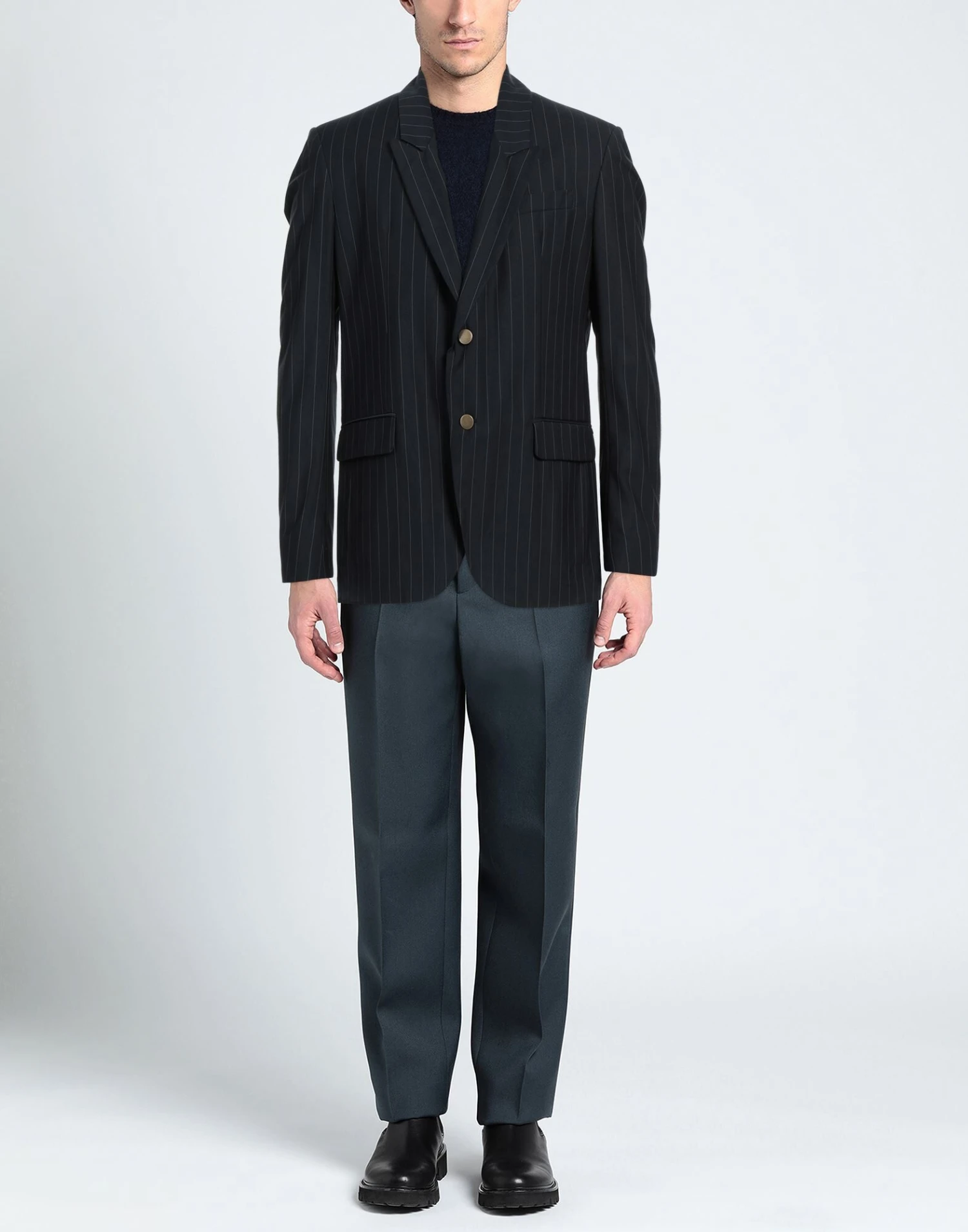 plain weave, no appliqués, pinstriped, lapel collar, single-breasted , long sleeves, partially lined interior, 2 buttons, multipockets, single-breasted jacket