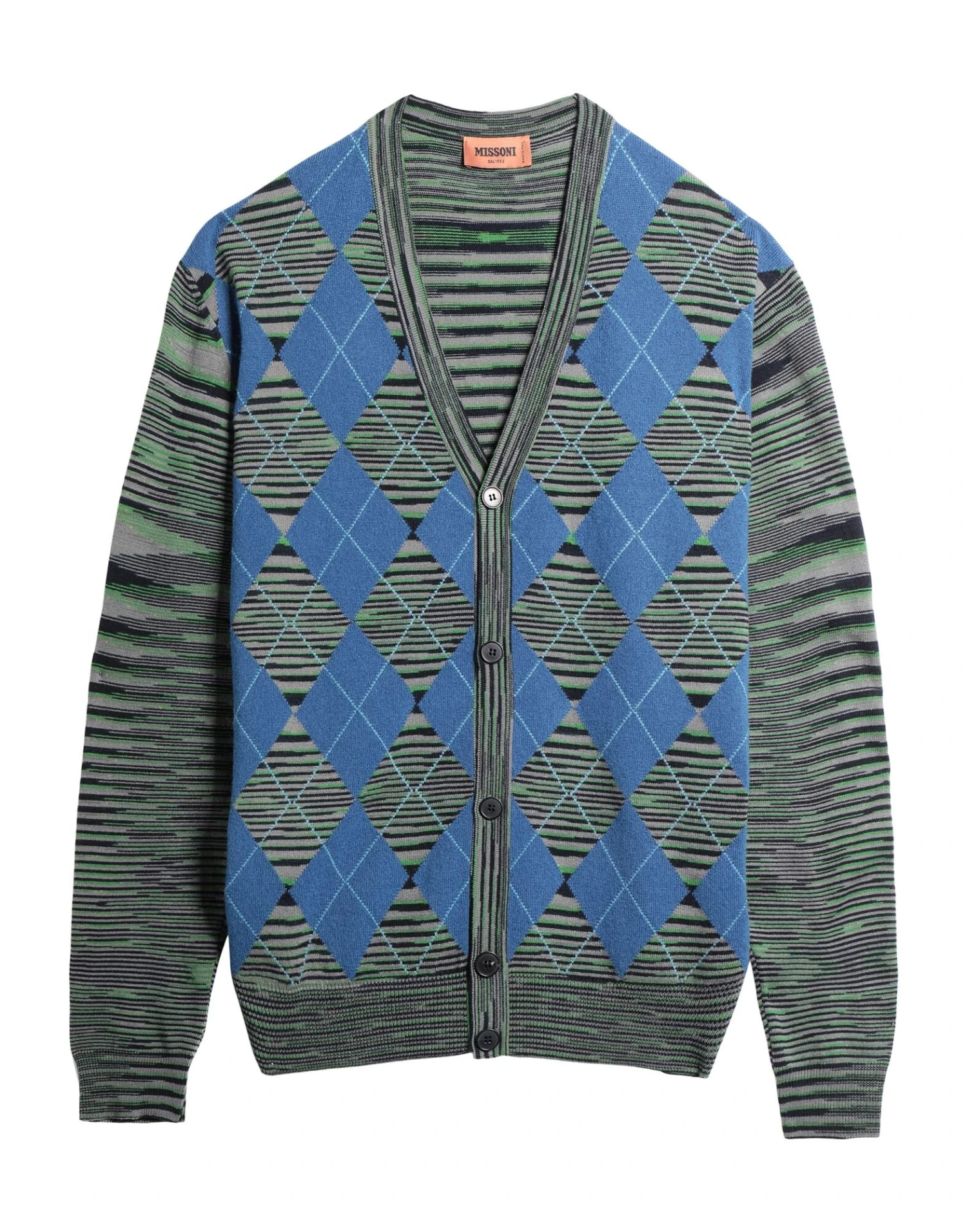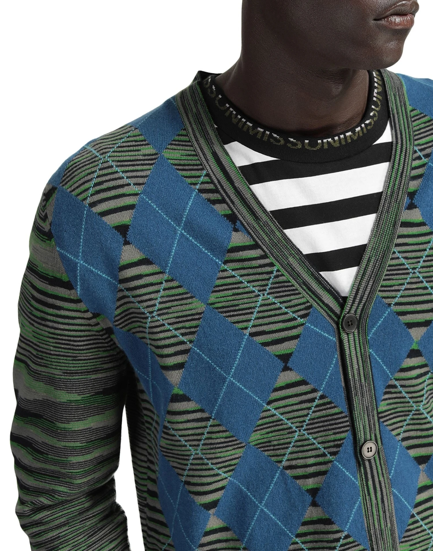knitted, no appliqués, lightweight knit, v-neck, geometric design, long sleeves, button closing, no pockets, large sized