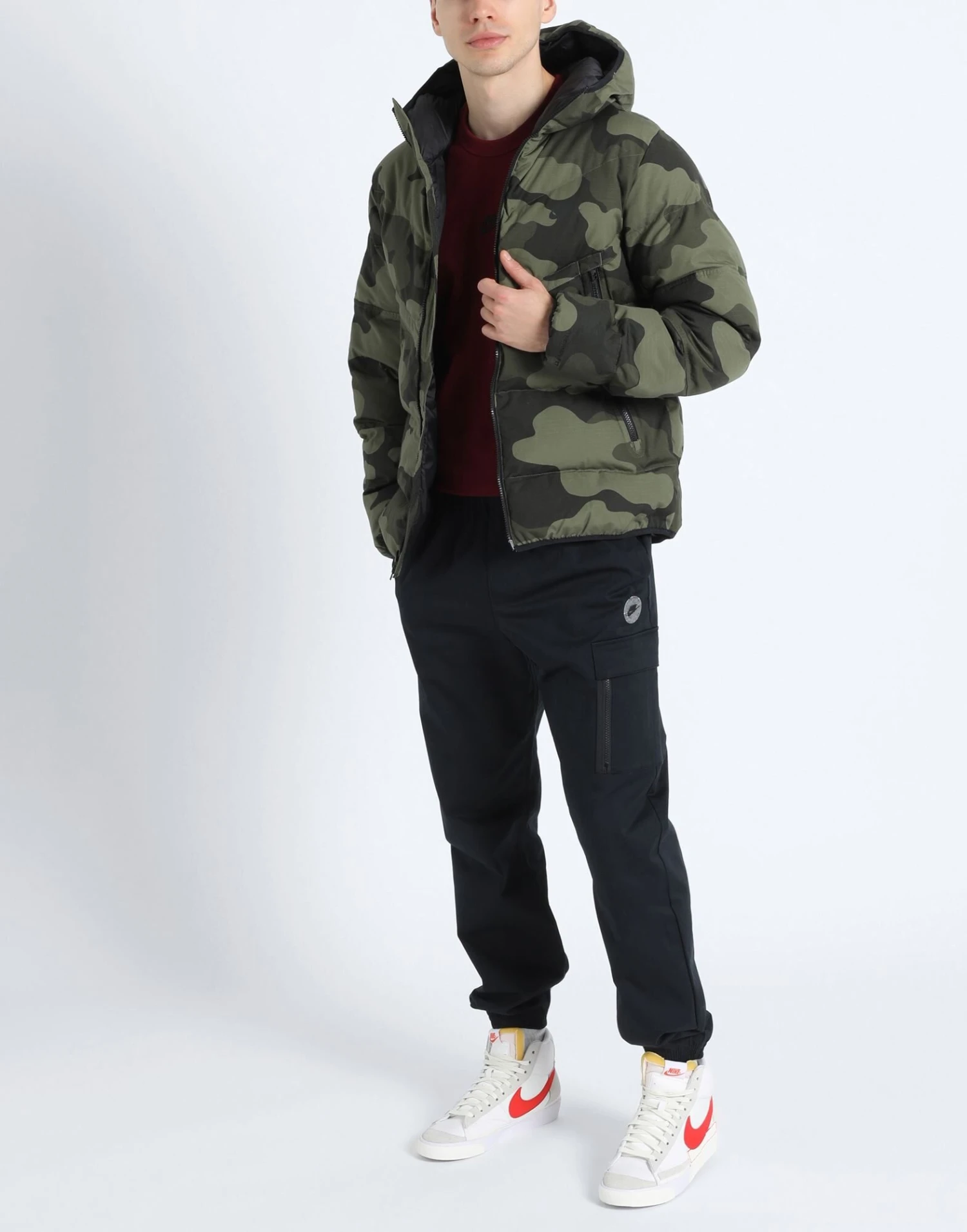 plain weave, quilted, brand logo, camouflage, hooded collar, single-breasted , long sleeves, cuffs with elastic, internal padding, zipper closure, multipockets, lifestyle, single-breasted jacket