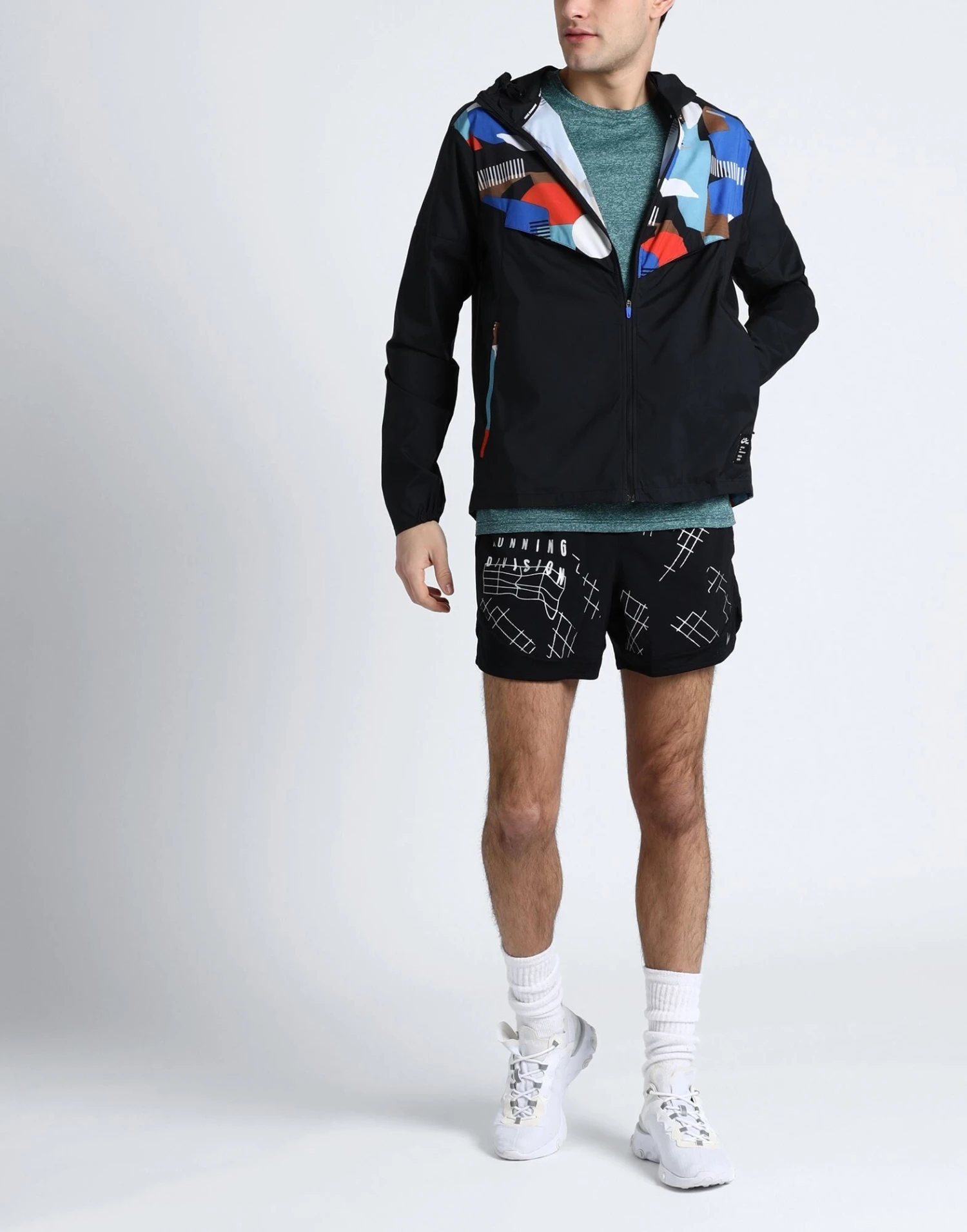 techno fabric, brand logo, multicolor pattern, hooded collar, single-breasted , long sleeves, cuffs with elastic, zipper closure, multipockets, lifestyle, stretch, windbreaker model