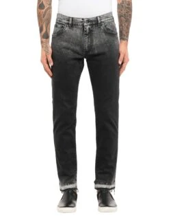 denim, coated effect, logo, solid color, colored wash, mid rise, front closure, button, zip, multipockets, contains non-textile parts of animal origin, stretch, large sized