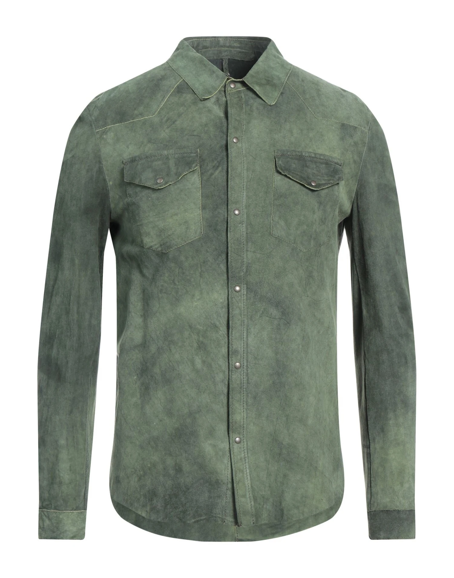 leather, no appliqués, solid color, classic neckline, long sleeves, snap buttons fastening, two breast pockets, contains non-textile parts of animal origin