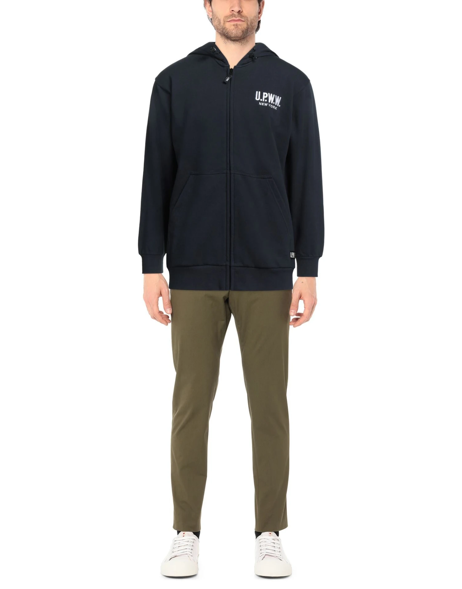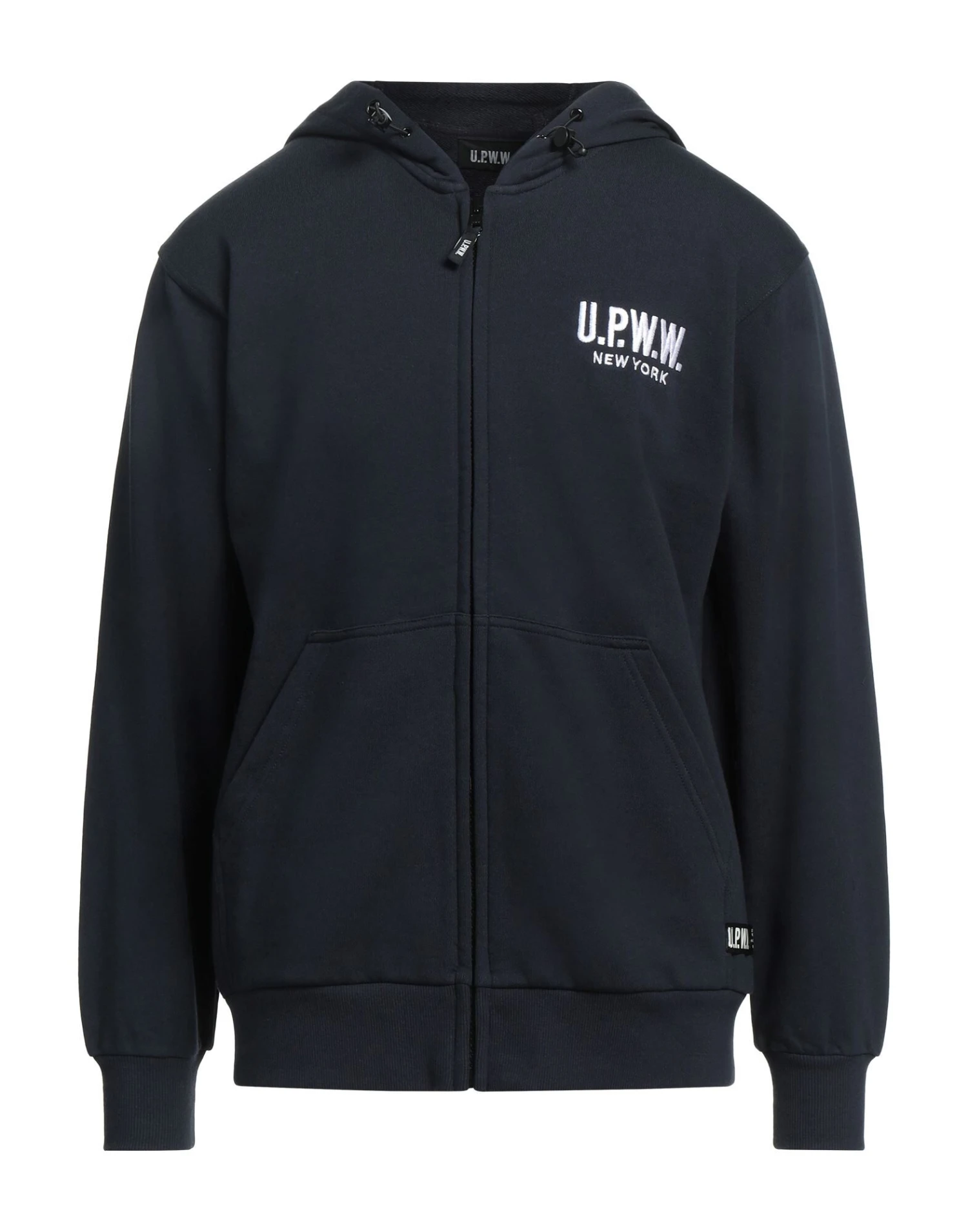sweatshirt fleece, brand logo, solid color, hooded collar, long sleeves, zipper closure, multipockets, french terry lining