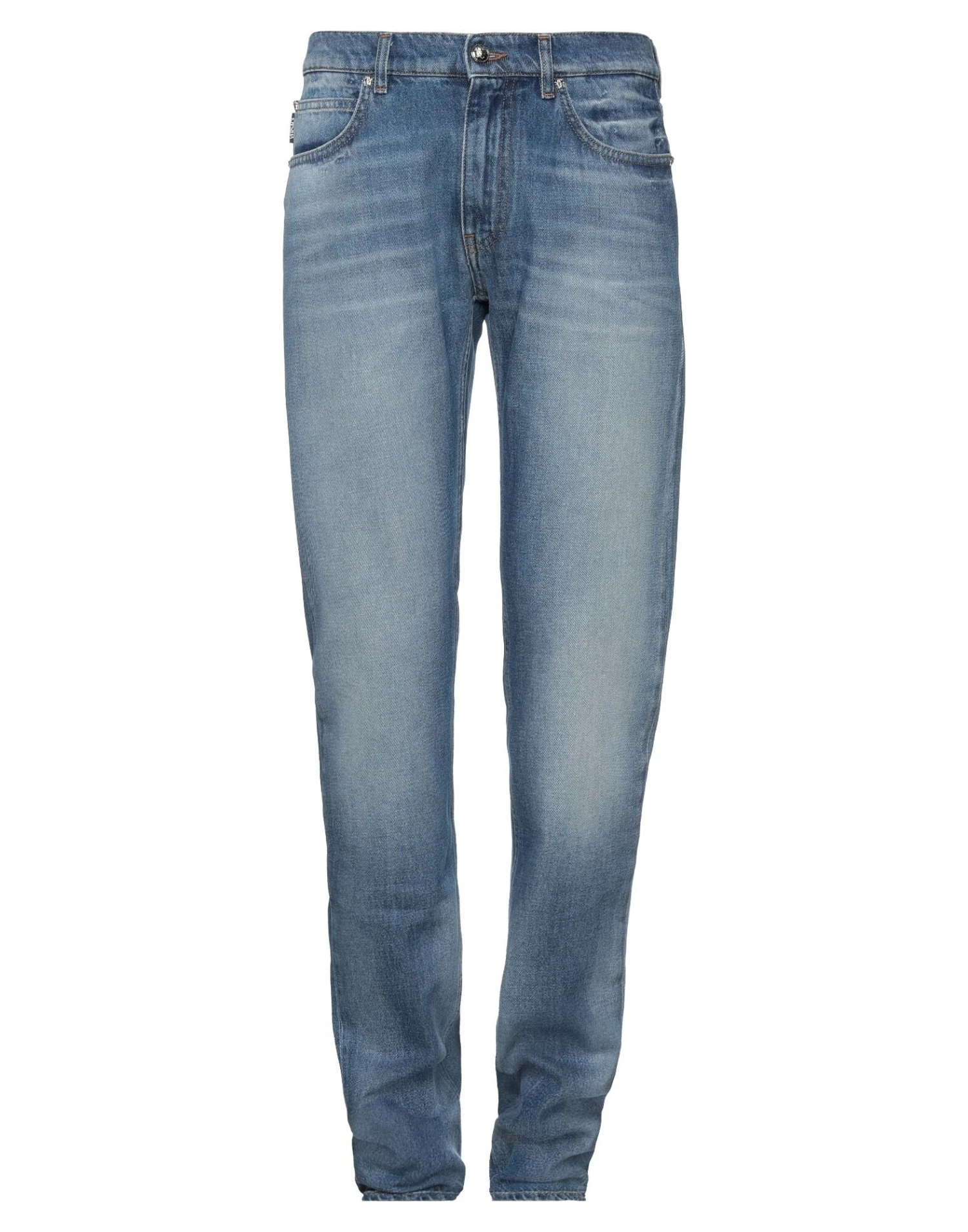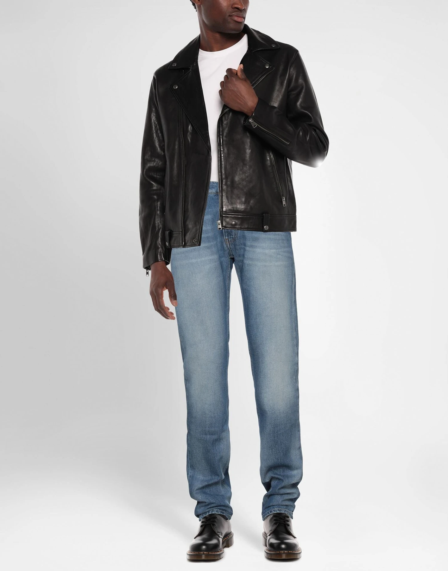 denim, faded, leather applications, brand logo, solid colour with appliqués, medium wash, mid rise, tapered leg, regular fit, 1 button, zipper closure, five pockets, contains non-textile parts of animal origin, large sized